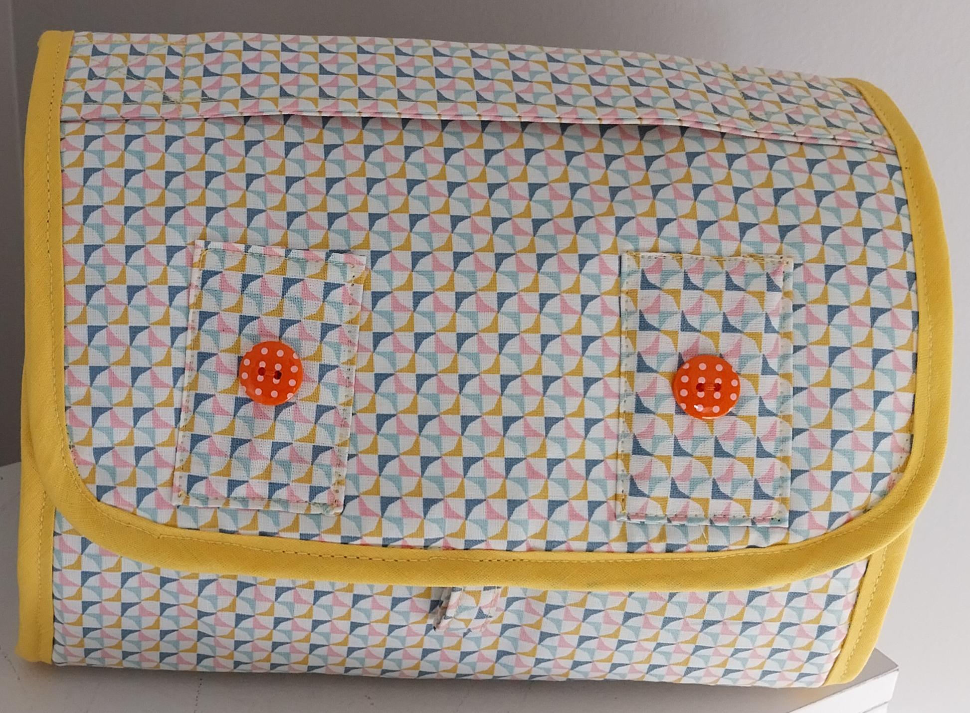 – Pour l’étape « pose de biais », personnellement, avant de coudre, j’épingle le biais tout autour pour être sûre qu’il se positionne bien notamment dans les angles de la pochette.